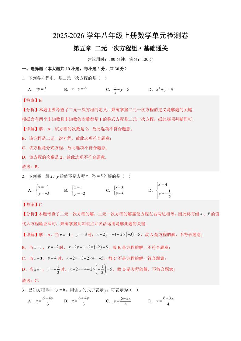 首页 > 全部 > 单元基础卷 > 第五章 二元一次方程组测试·基础卷(解析版)