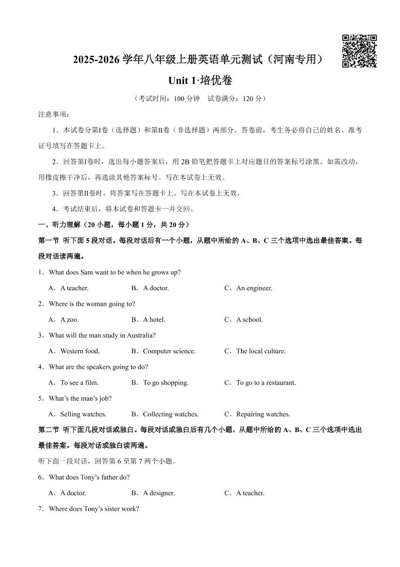 首页 > 全部 > 单元提升卷 > 八年级英语上册Unit 1 单元测试·河南专用(考试版A4)