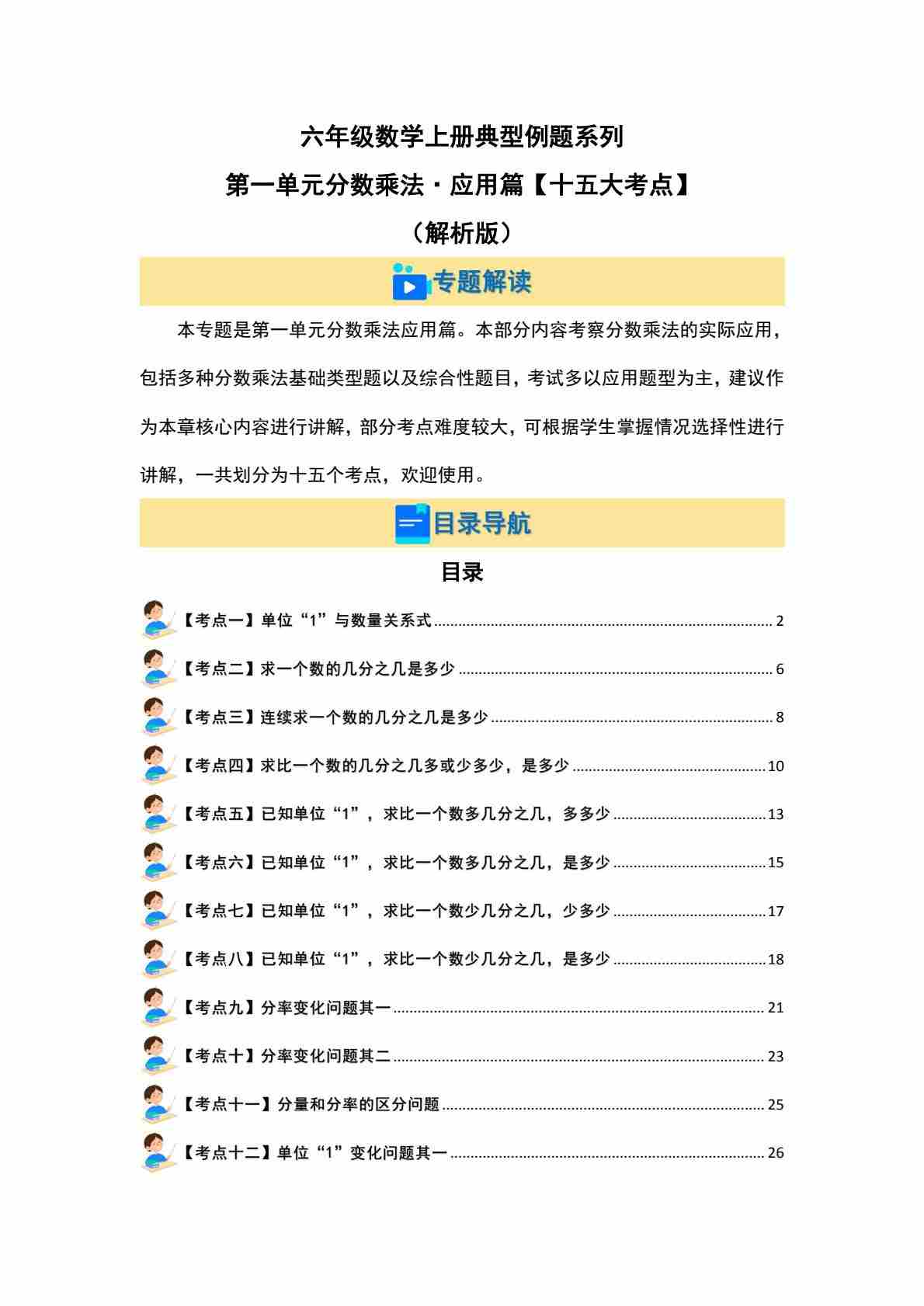 首页 > 全部 > 专项练习 > 六上人教版数学【第一单元分数乘法·应用篇(十五大考点)典型例题系列(解析版)】
