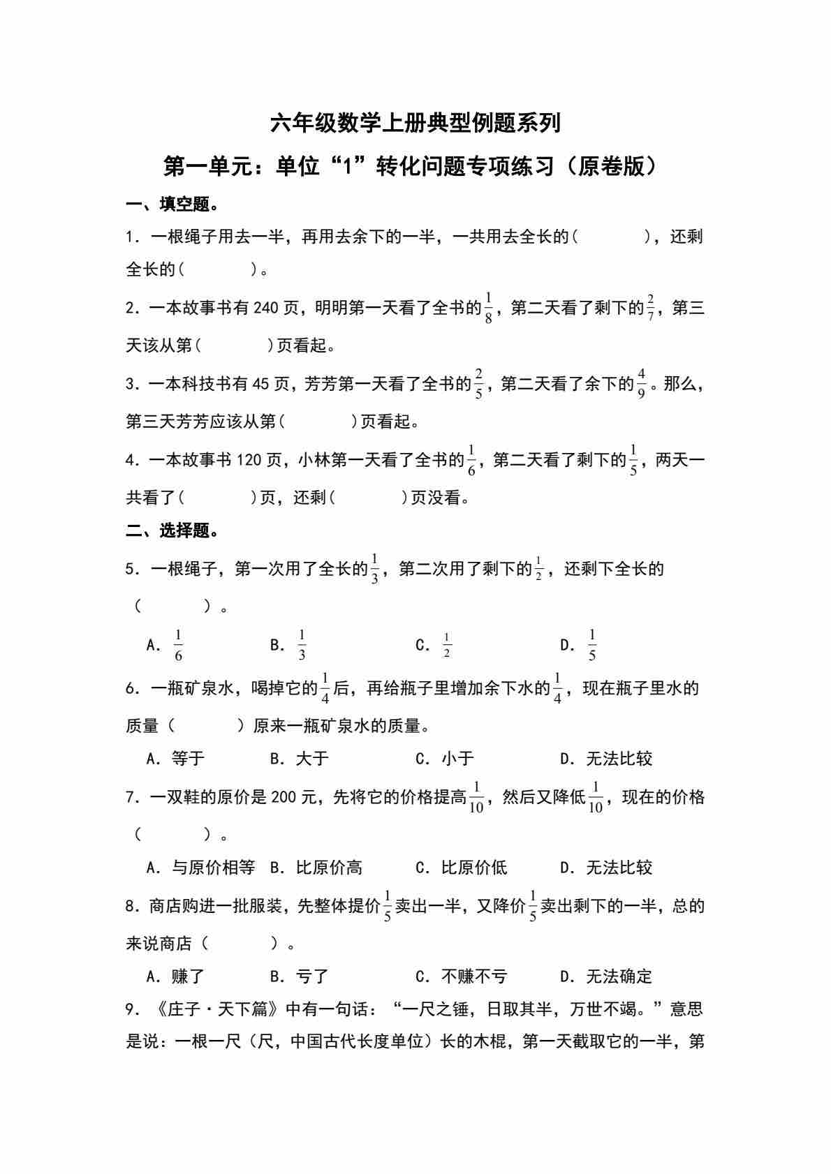 六上人教版数学【第一单元:单位“1”转化问题专项练习-典型例题系列(原卷版)】