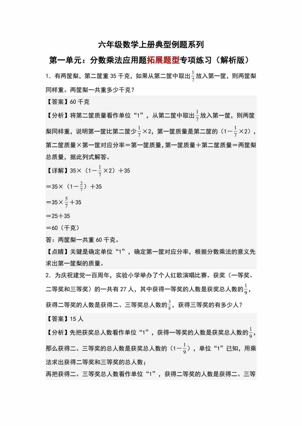 六上人教版数学【第一单元:分数乘法应用题“拓展题型”专项练习-典型例题系列(解析版)】