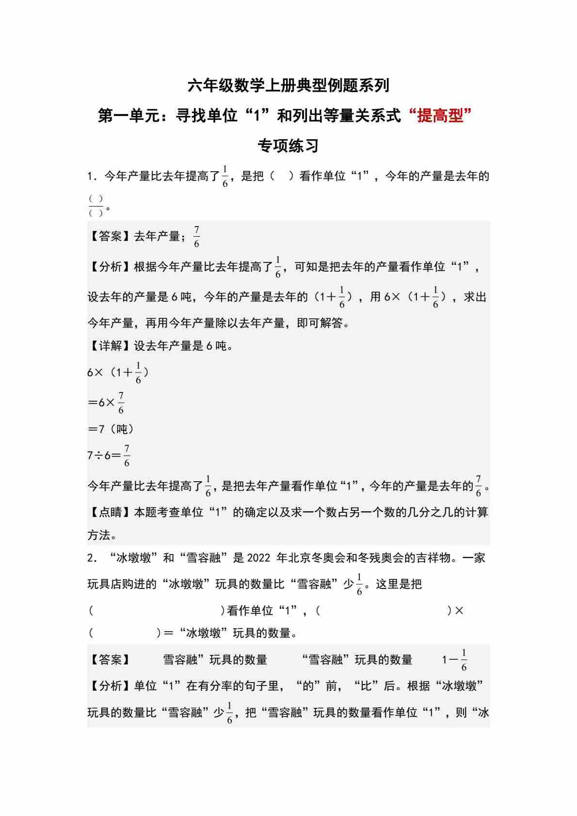 首页 > 全部 > 专项练习 > 六上人教版数学【第一单元:寻找单位“1”和列出等量关系式“提高型”专项练习-典型例题系列(解析版)】