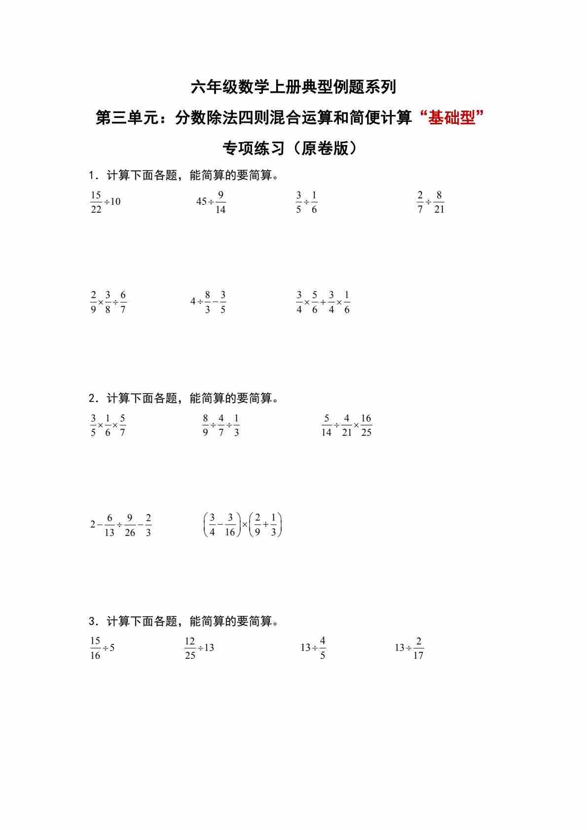首页 > 全部 > 专项练习 > 六上人教版数学【第三单元:分数除法四则混合运算和简便计算“基础型”专项练习-典型例题系列(原卷版)】