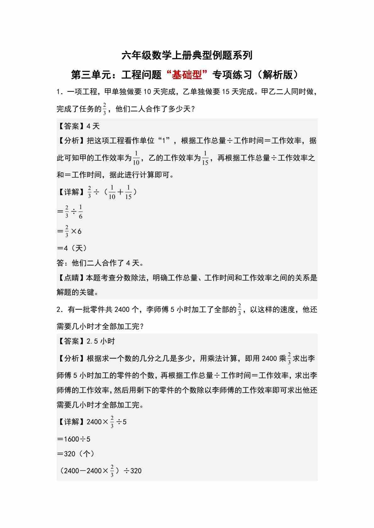 首页 > 全部 > 专项练习 > 六上人教版数学【第三单元:工程问题“基础型”专项练习-典型例题系列(解析版)】