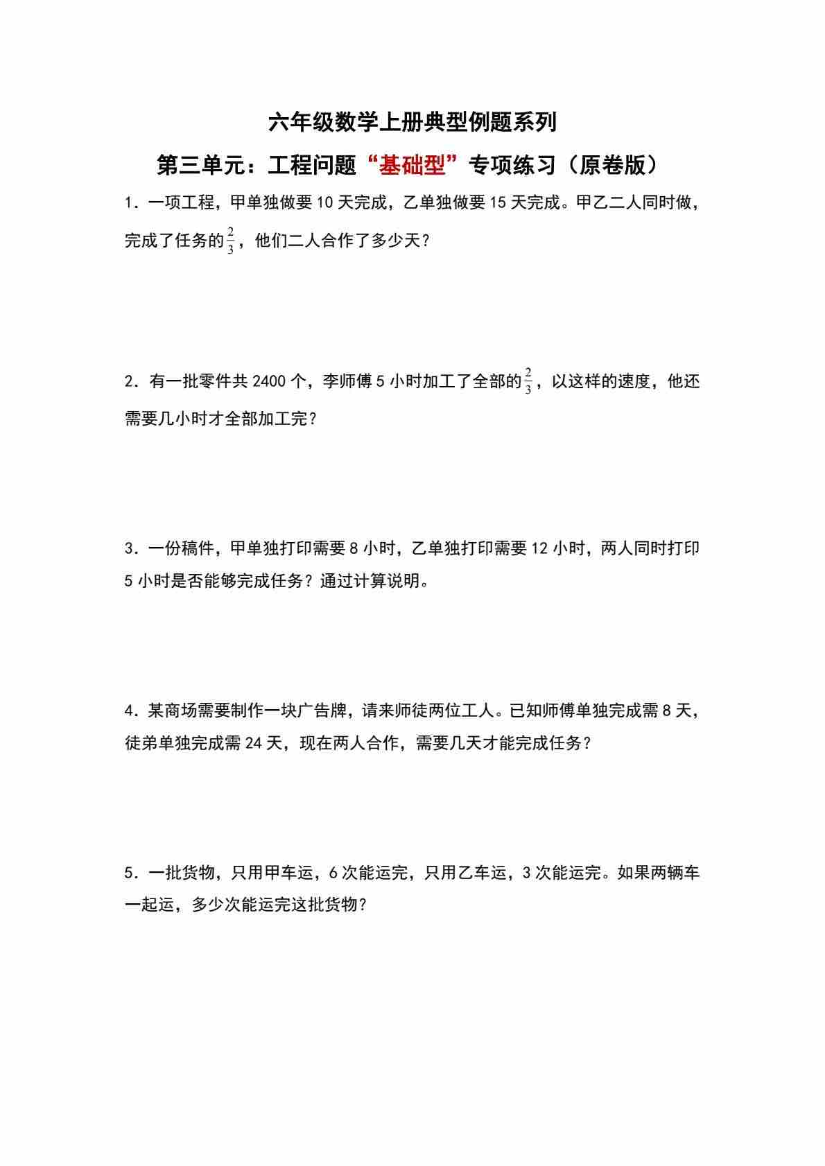 六上人教版数学【第三单元:工程问题“基础型”专项练习-典型例题系列(原卷版)】