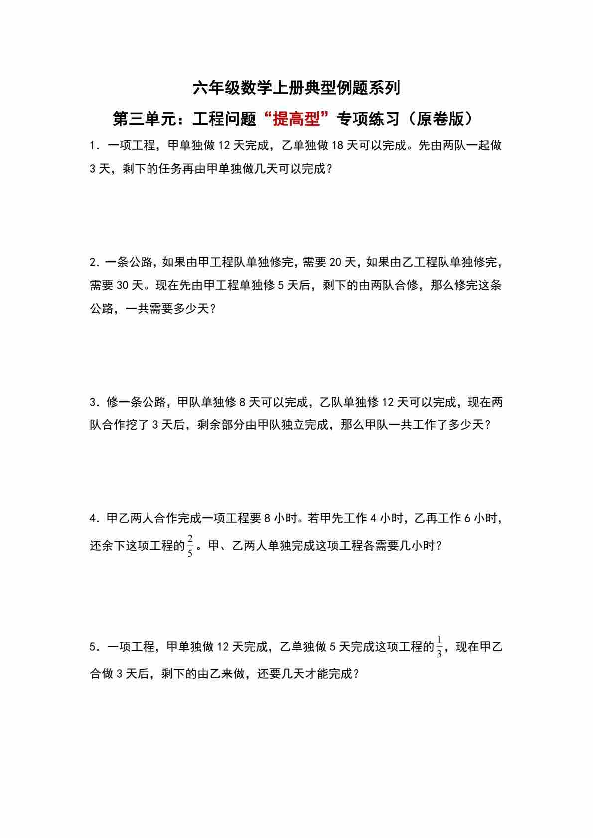 六上人教版数学【第三单元:工程问题“提高型”专项练习-典型例题系列(原卷版)】