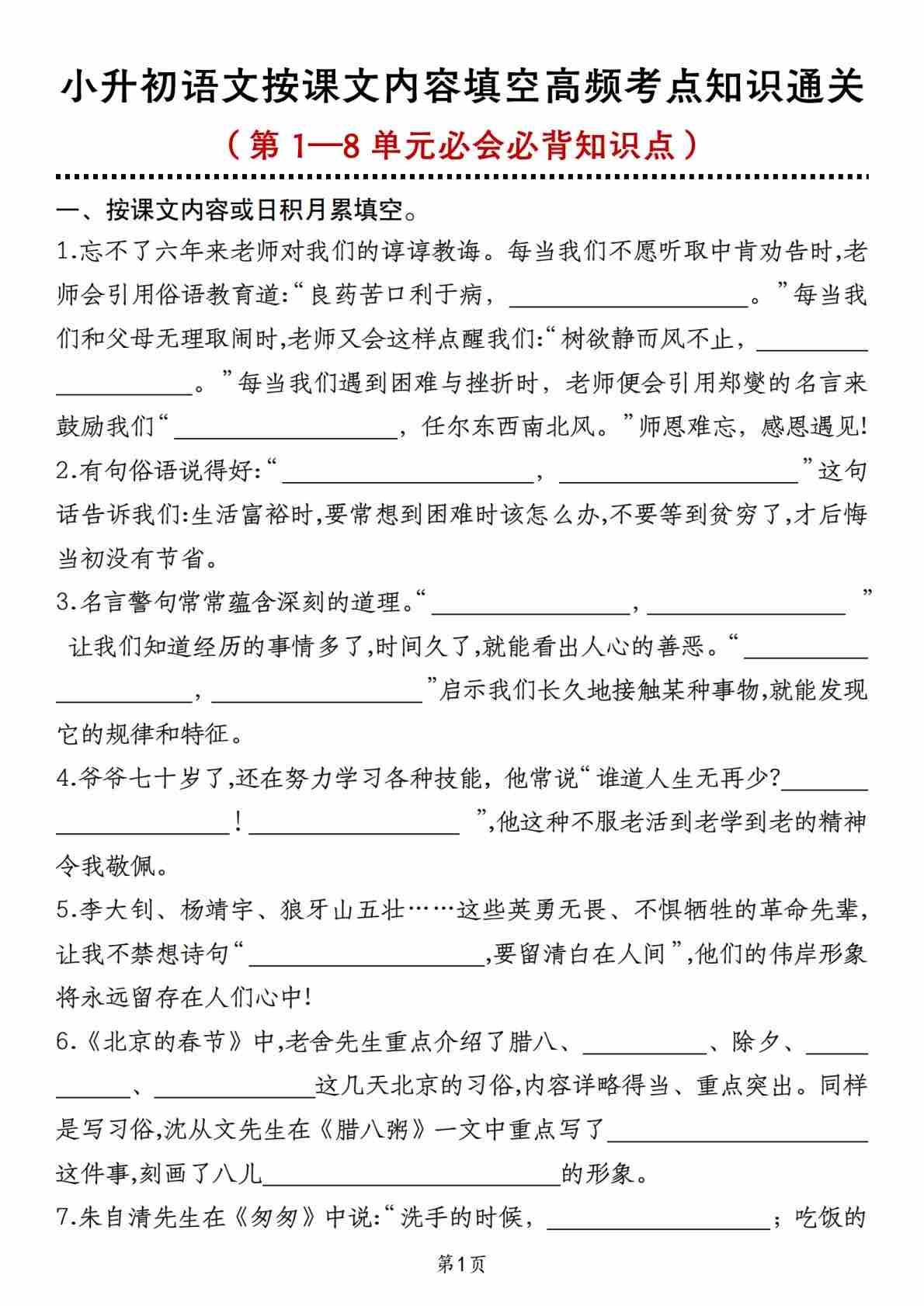 小升初语文按课文内容填空高频考点知识通关(第1—8单元必会必背知识点)88
