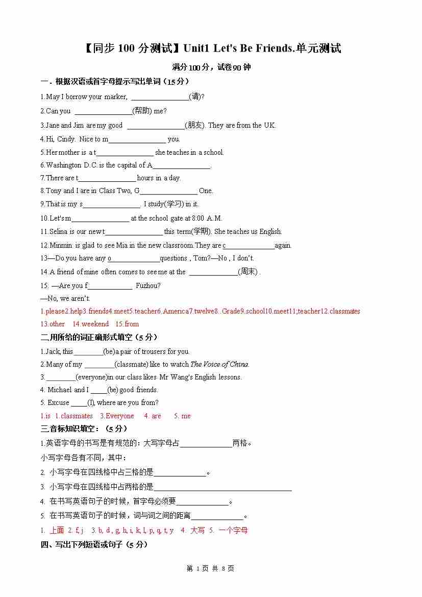 首页 > 全部 > 单元测试 > 【同步100分测试】Unit1 Let's Be Friends.单元测试(解析版)