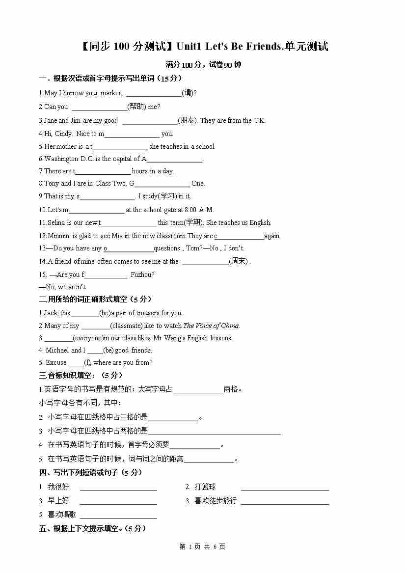 【同步100分测试】Unit1 Let's Be Friends.单元测试(原卷版)
