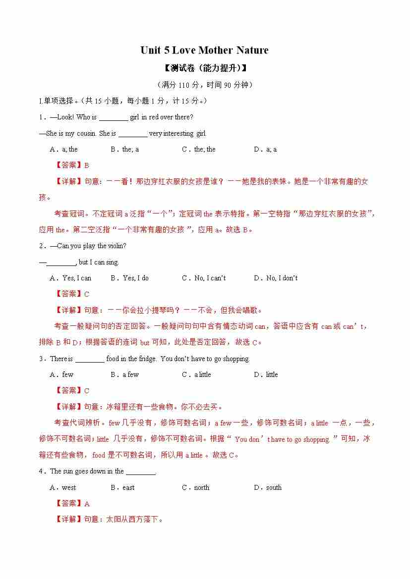 首页 > 全部 > 单元地区卷 > Unit 5 Love Mother Nature(单元卷·培优提升)(解析版)