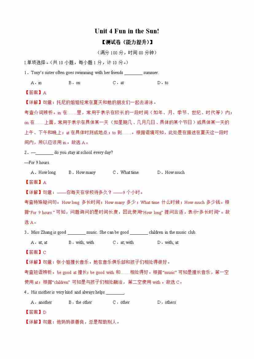 首页 > 全部 > 单元地区卷 > Unit 4 Fun in the Sun!(单元卷·培优提升)(解析版)