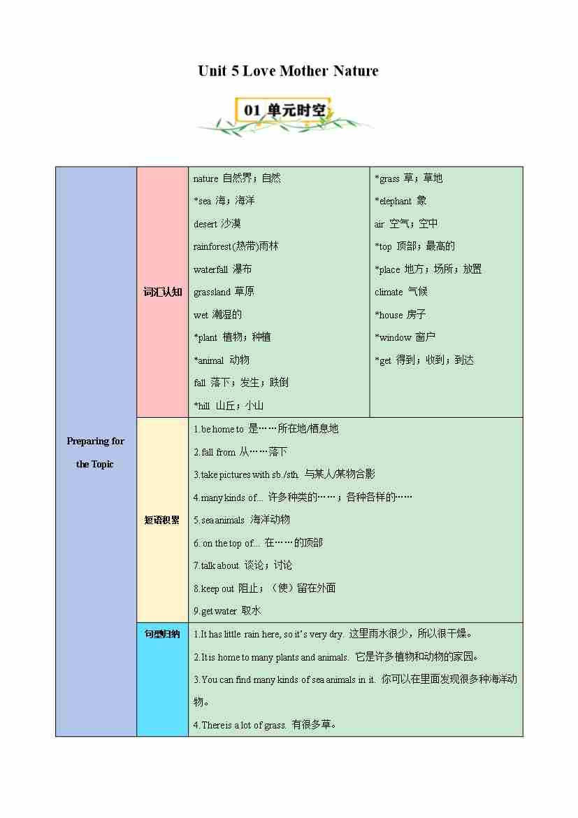 Unit 5 Love Mother Nature【速记清单】-2024-2025学年七年级英语上册单元速记•巧练(仁爱版)(教师版)