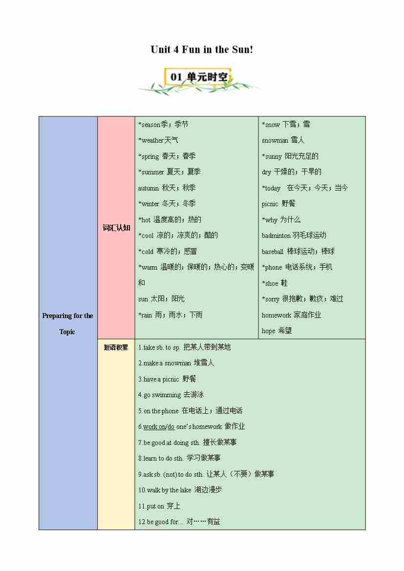 首页 > 全部 > 速记清单 > Unit 4 Fun in the Sun!【速记清单】-2024-2025学年七年级英语上册单元速记•巧练(仁爱版)(教师版)