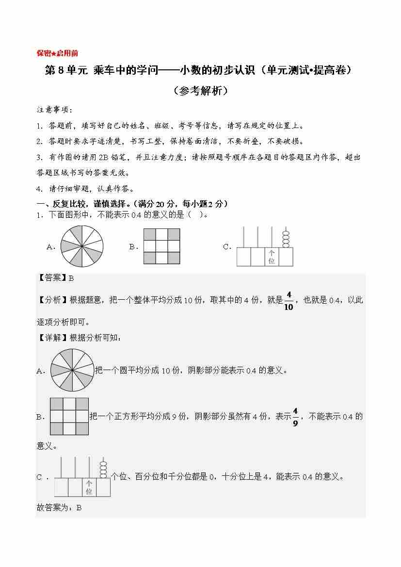 首页 > 全部 > 单元测试 > 第8单元 乘车中的学问——小数的初步认识(单元测试•提高卷)数学青岛版(五四制)三年级上册(参考解析)