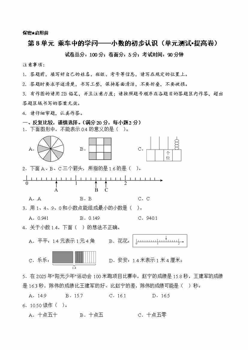 首页 > 全部 > 单元测试 > 第8单元 乘车中的学问——小数的初步认识(单元测试•提高卷)数学青岛版(五四制)三年级上册(A4版)