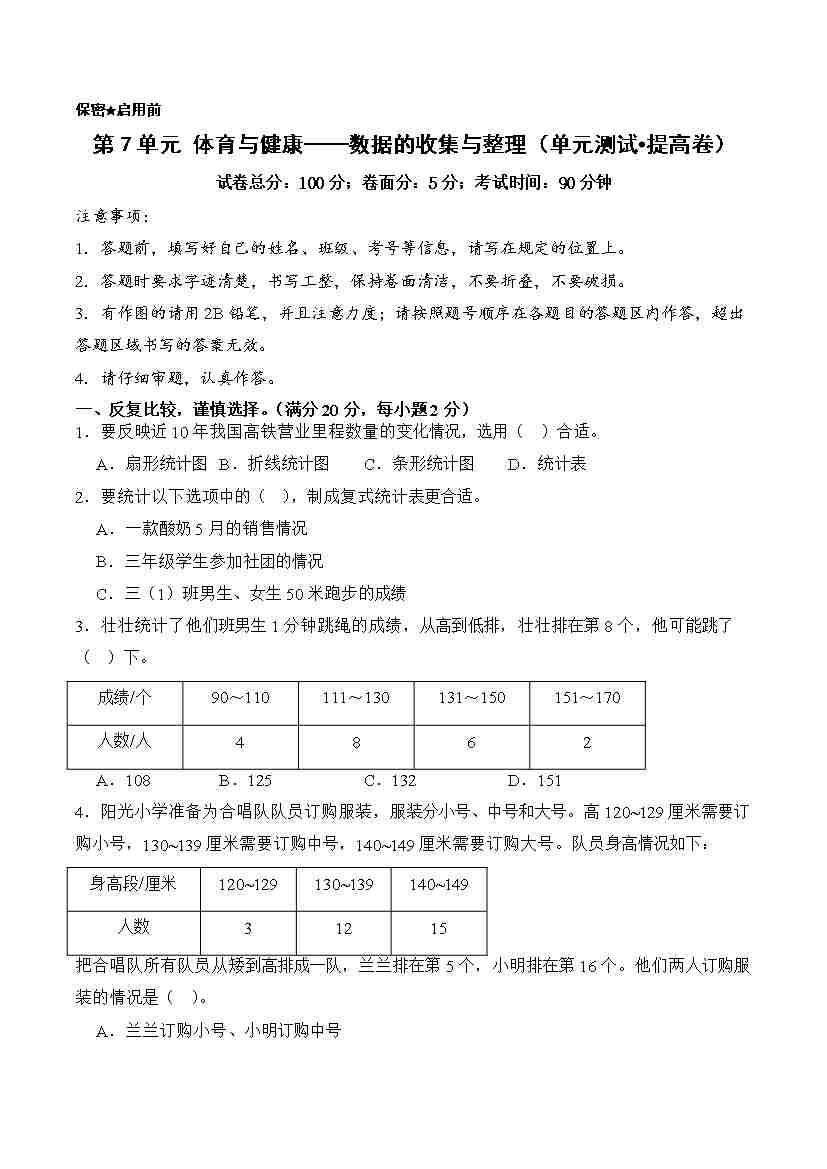 第7单元 体育与健康——数据的收集与整理(单元测试•提高卷)数学青岛版(五四制)三年级上册(A4版)