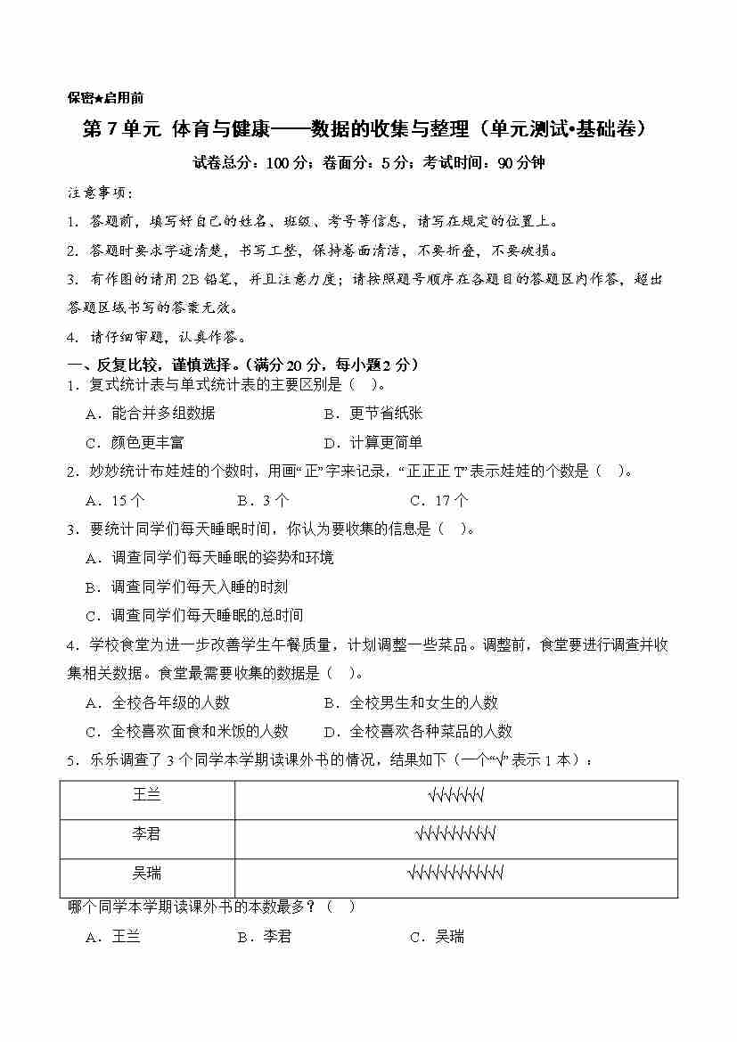 首页 > 全部 > 单元测试 > 第7单元 体育与健康——数据的收集与整理(单元测试•基础卷)数学青岛版(五四制)三年级上册(A4版)