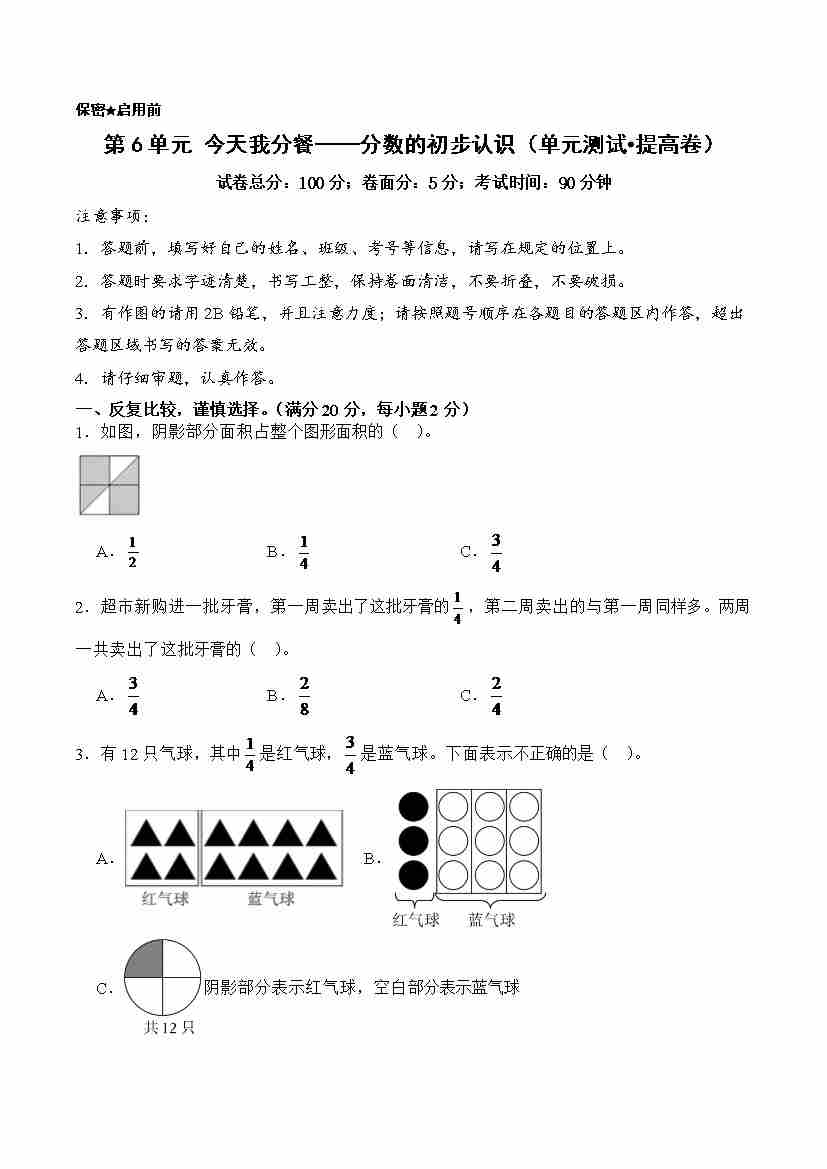 第6单元 今天我分餐——分数的初步认识(单元测试•提高卷)数学青岛版(五四制)三年级上册(A4版)