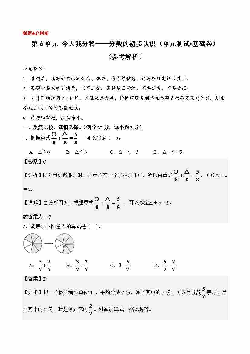 首页 > 全部 > 单元测试 > 第6单元 今天我分餐——分数的初步认识(单元测试•基础卷)数学青岛版(五四制)三年级上册(参考解析)