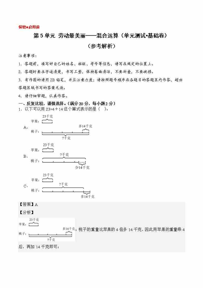 首页 > 全部 > 单元测试 > 第5单元 劳动最美丽——混合运算(单元测试•基础卷)数学青岛版(五四制)三年级上册(参考解析)