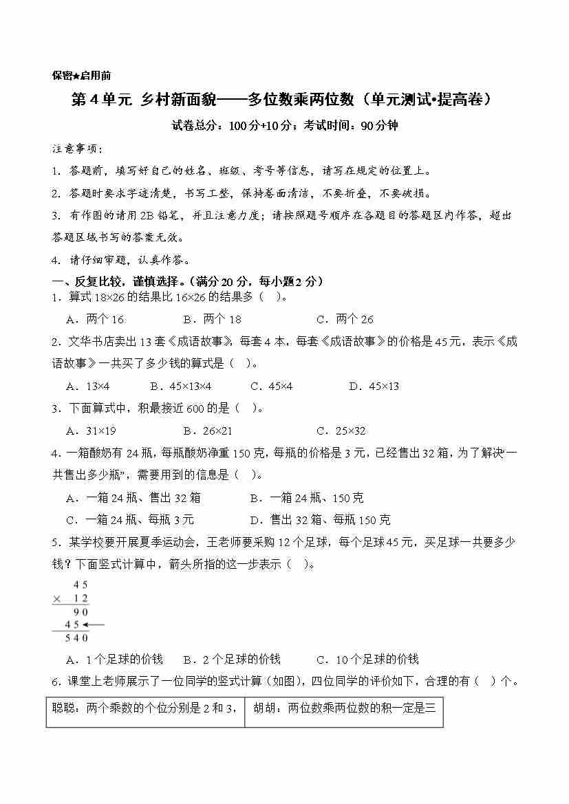 第4单元 乡村新面貌——多位数乘两位数(单元测试•提高卷)数学青岛版(五四制)三年级上册(A4版)