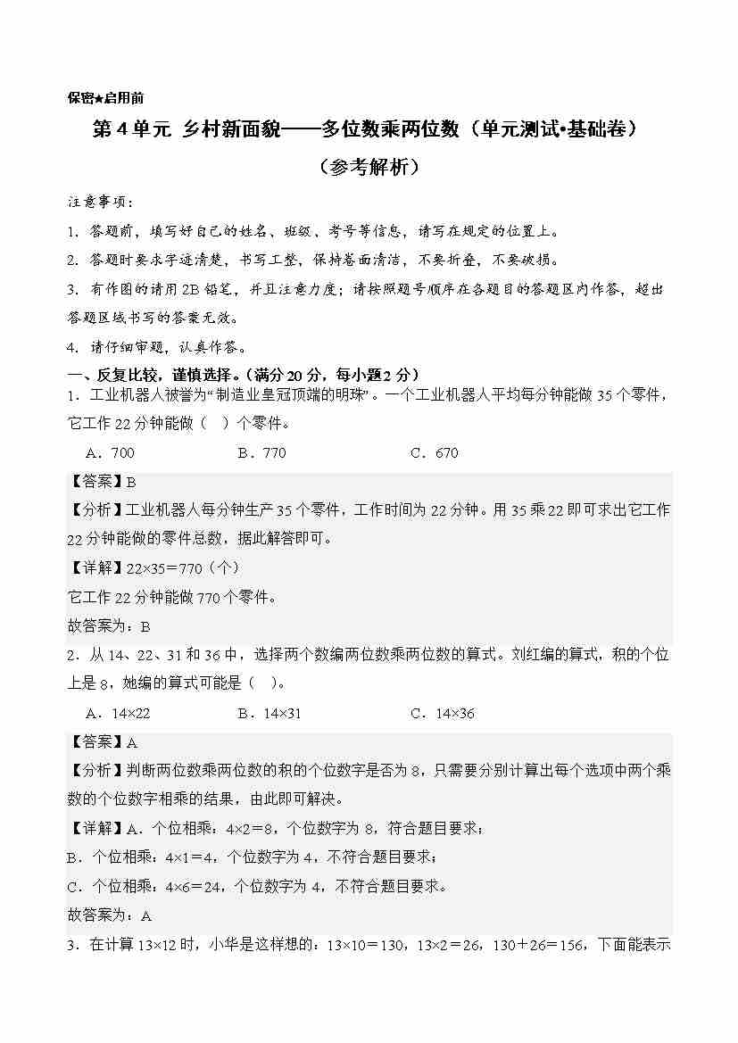第4单元 乡村新面貌——多位数乘两位数(单元测试•基础卷)数学青岛版(五四制)三年级上册(参考解析)