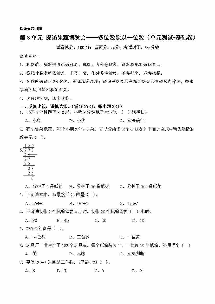 第3单元 探访果蔬博览会——多位数除以一位数(单元测试•基础卷)数学青岛版(五四制)三年级上册(A4版)
