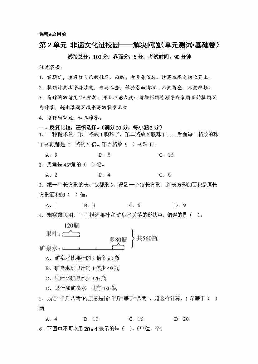 第2单元 非遗文化进校园——解决问题(单元测试•基础卷)数学青岛版(五四制)三年级上册(A4版)