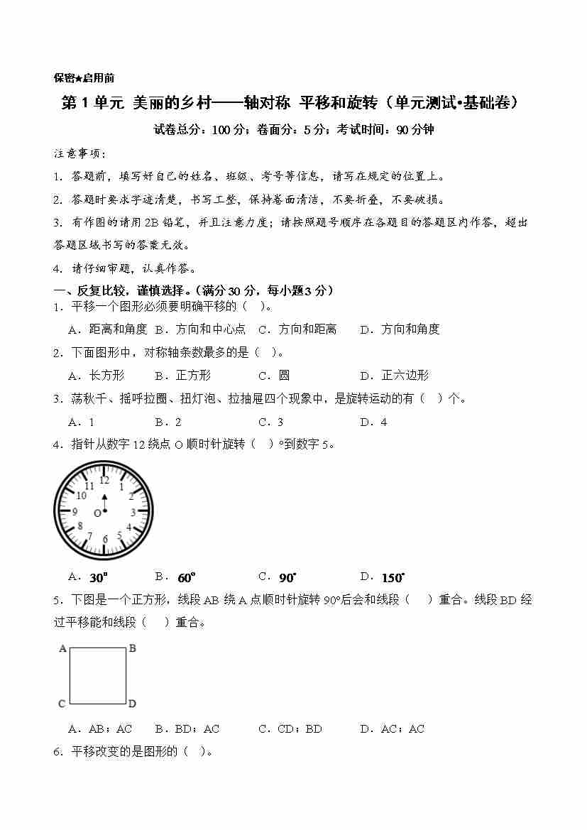首页 > 全部 > 单元测试 > 第1单元 美丽的乡村——轴对称 平移和旋转(单元测试•基础卷)数学青岛版(五四制)三年级上册(A4版)