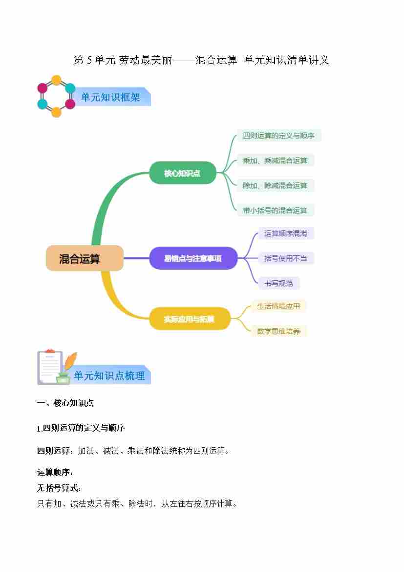 首页 > 全部 > 知识清单 > 第5单元 劳动最美丽——混合运算-单元复习讲义(原卷版)