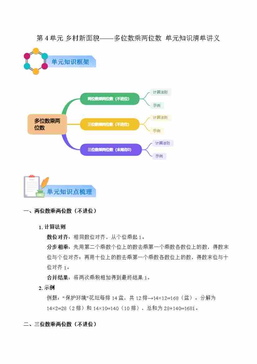 首页 > 全部 > 知识清单 > 第4单元 乡村新面貌——多位数乘两位数-单元复习讲义(解析版)
