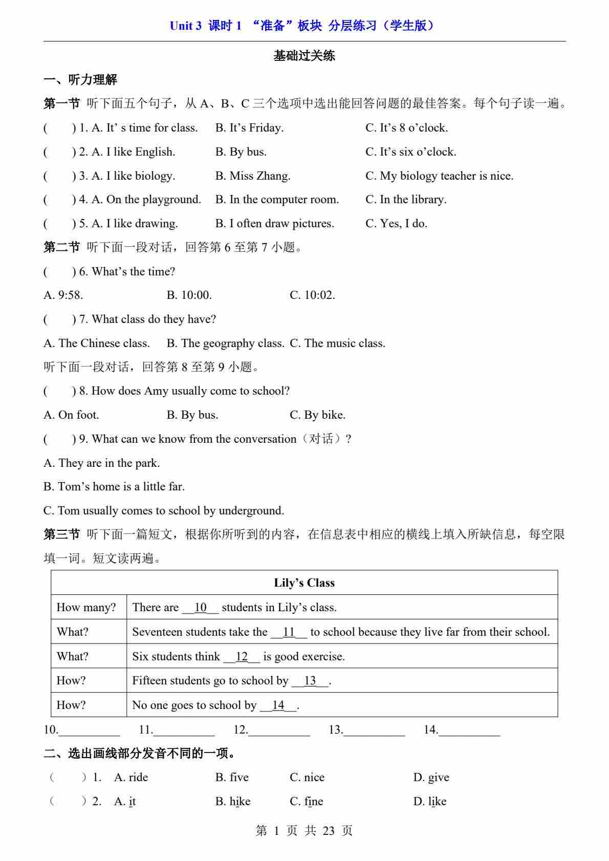 Unit 3 课时1 “准备”板块(分层练习)