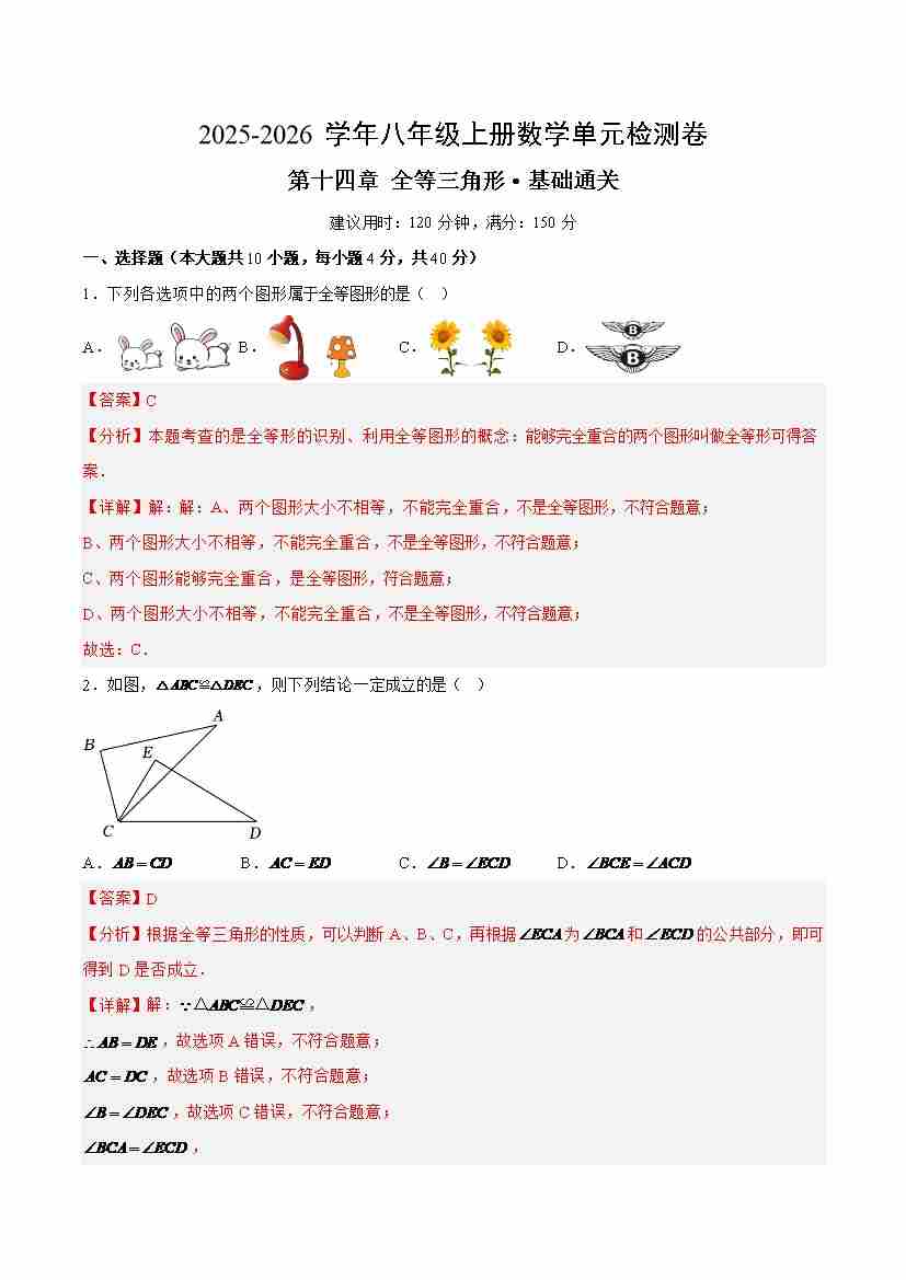 第14章 全等三角形 测试·基础卷(解析版)