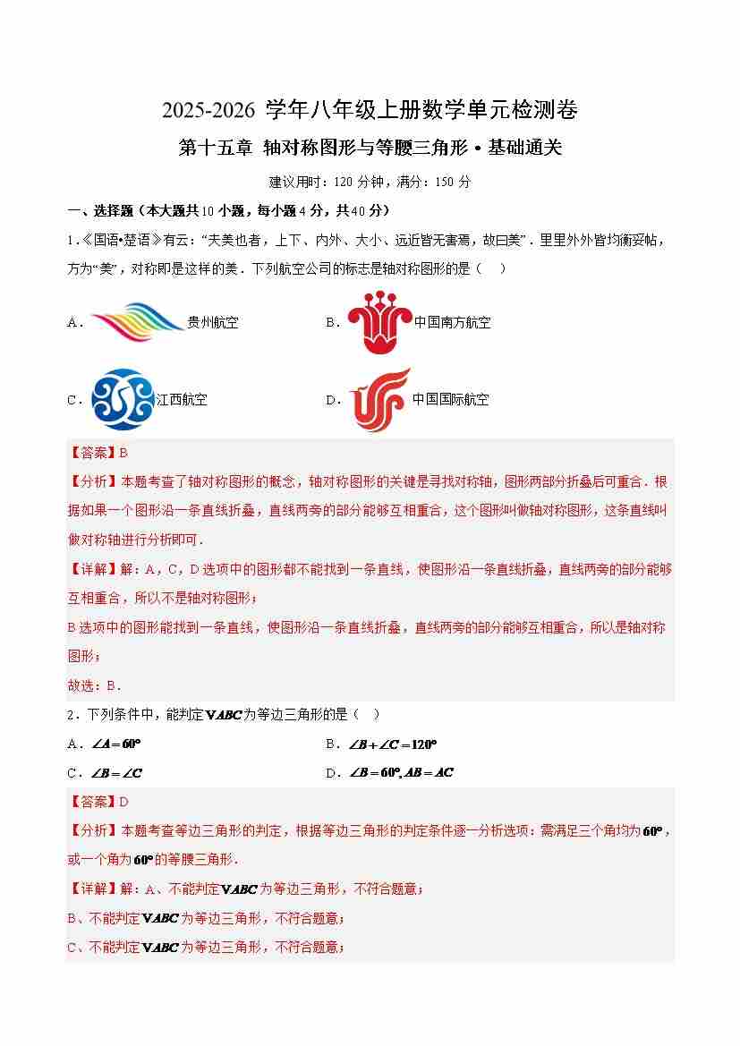 第15章 轴对称图形与等腰三角形 测试·基础卷(解析版)