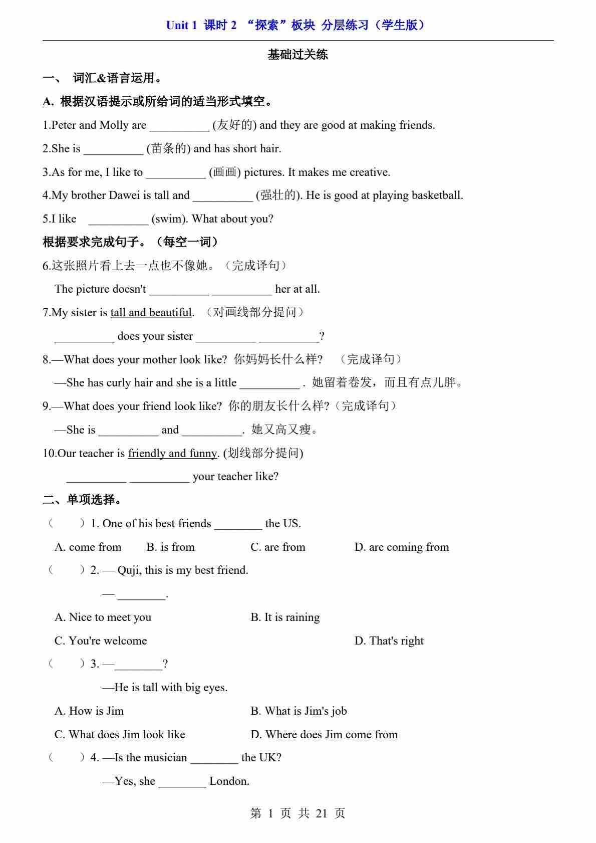 Unit 1 课时2 “探索”板块(分层练习)
