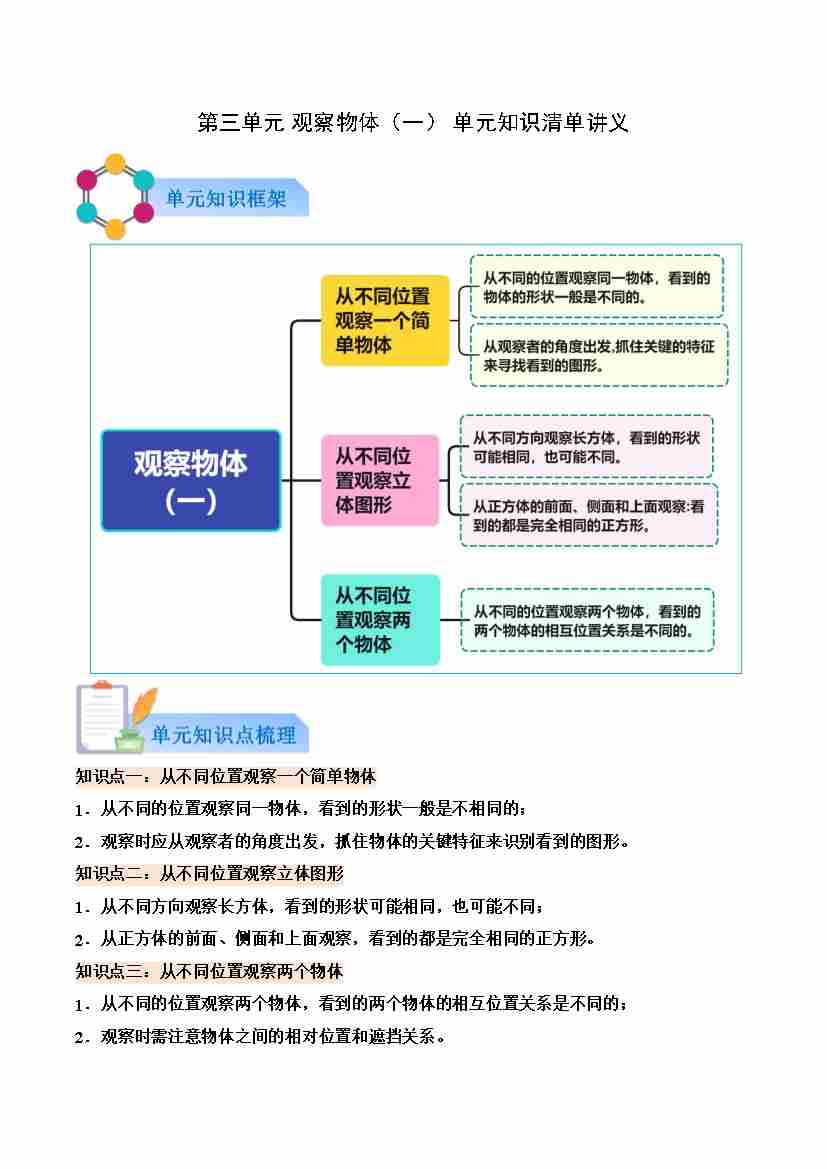 首页 > 全部 > 知识清单 > 第三单元 谁的眼睛亮——观察物体(一)(知识清单)数学青岛版三年级上册(解析版)
