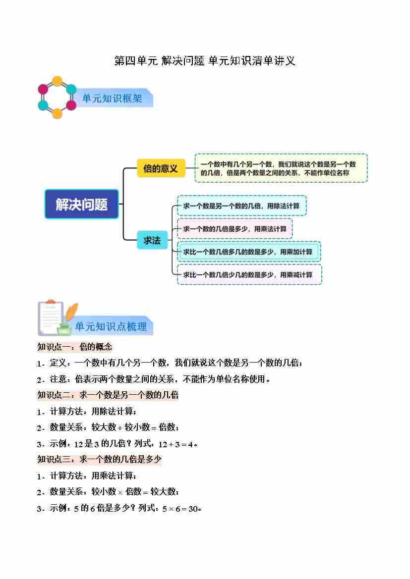 第四单元 非遗文化进校园——解决问题(单元复习知识清单)数学青岛版三年级上册(原卷版)