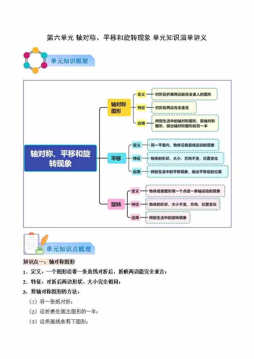 首页 > 全部 > 知识清单 > 第六单元 美丽乡村——轴对称、平移和旋转现象(知识清单)数学青岛版三年级上册(解析版)