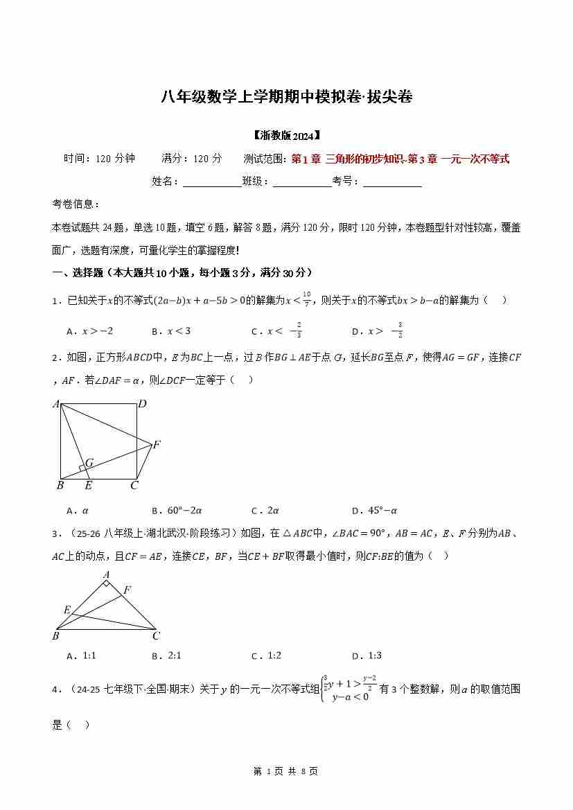 2025八上数学期中模拟卷·拔尖卷(浙教版2024)(原卷版)