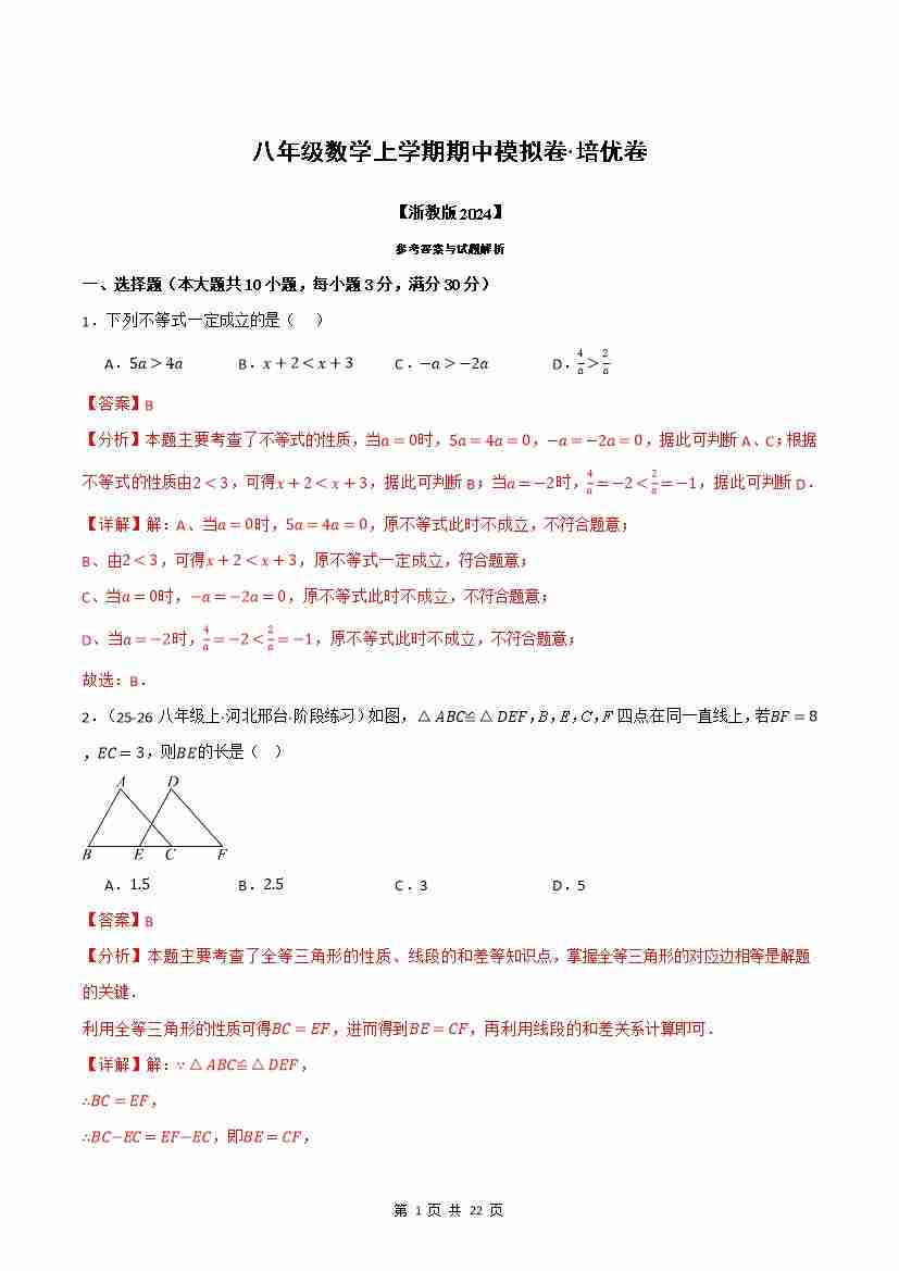 首页 > 全部 > 期中试卷 > 2025八上数学期中模拟卷·培优卷(浙教版2024)(解析版)