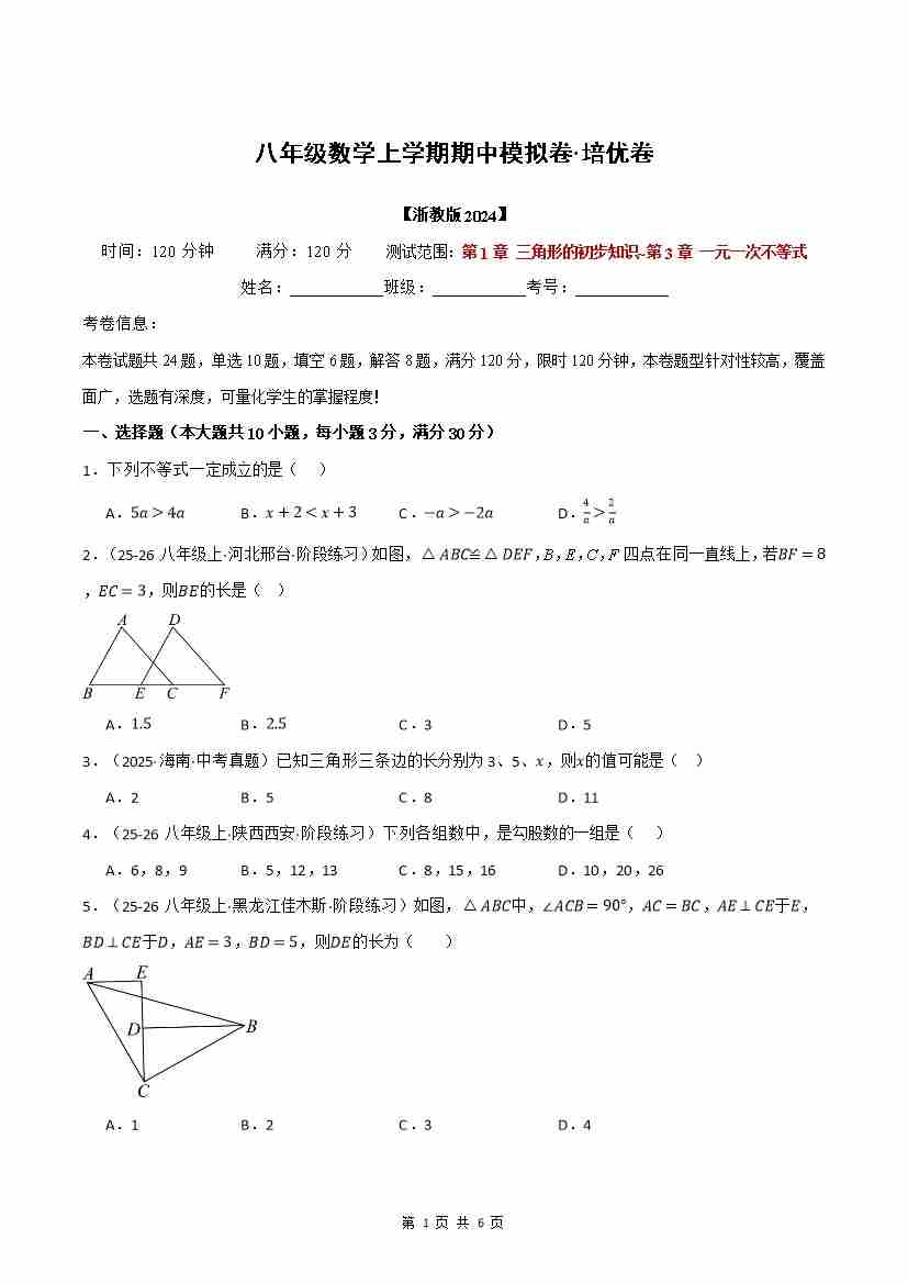 首页 > 全部 > 期中试卷 > 2025八上数学期中模拟卷·培优卷(浙教版2024)(原卷版)