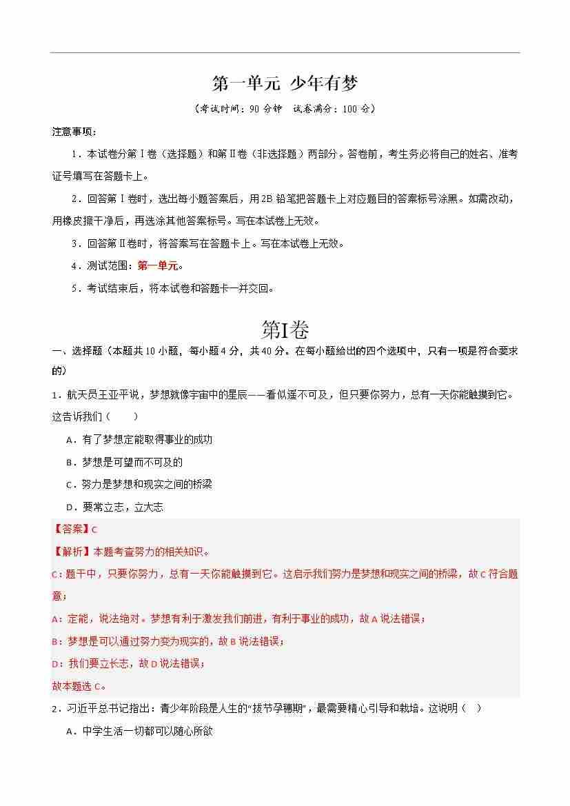 首页 > 全部 > 单元检测 > 第一单元 少年有梦 【单元测试·提升卷】 (解析版)