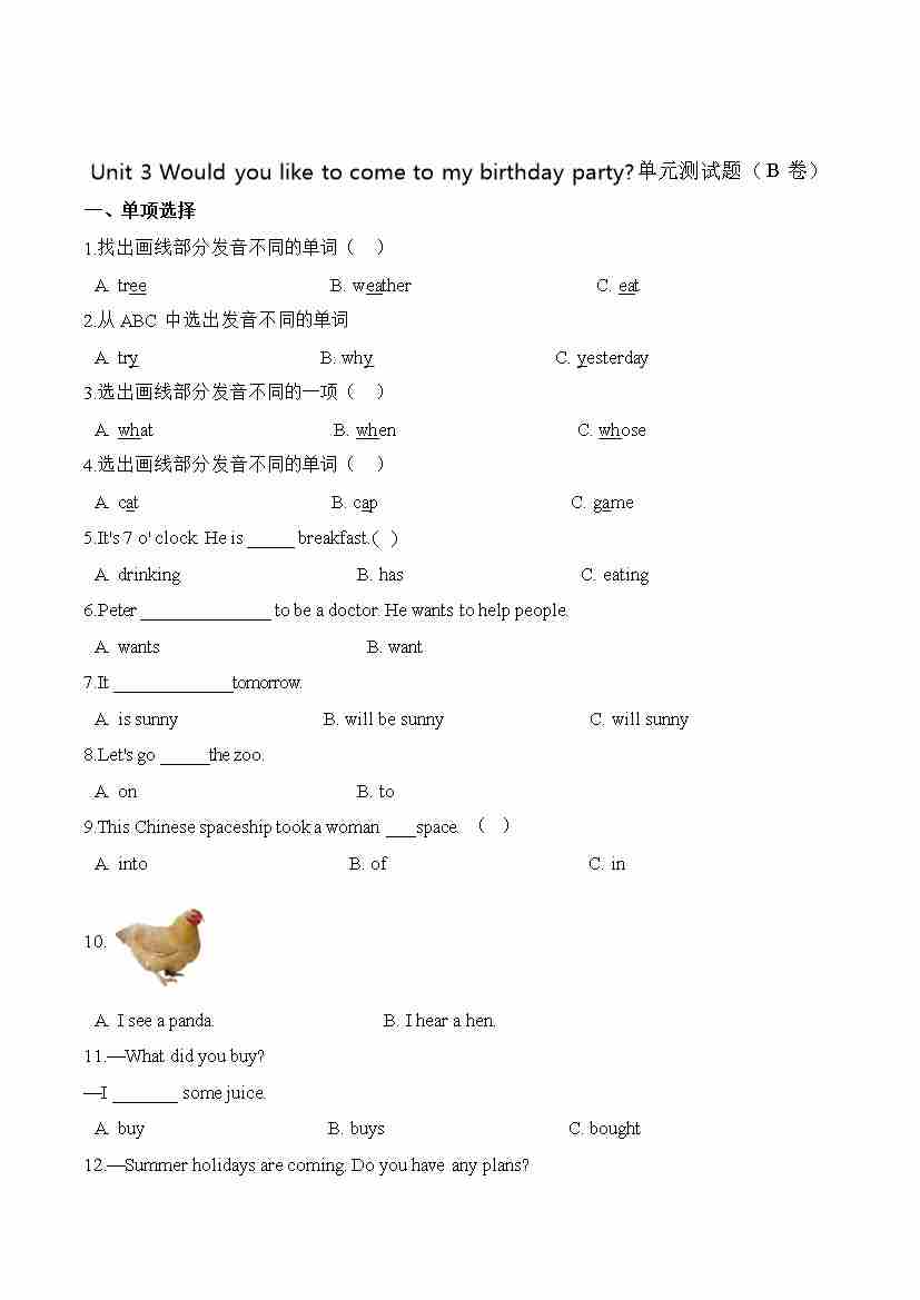 首页 > 全部 > 单元测试 > 【精品】六年级上册英语第三单元测试题 (B卷)-Unit 3 Would you like to come to my birthday party 人教精通版(含答案)