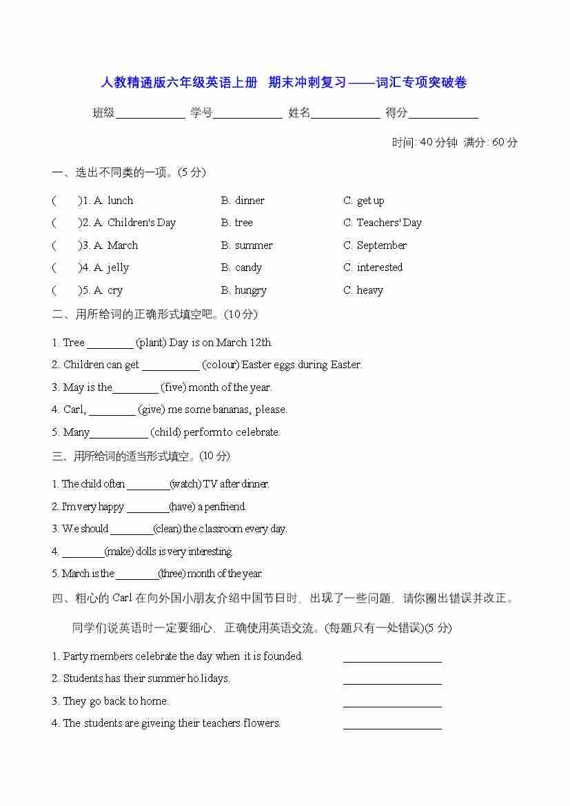 首页 > 全部 > 期末专项 > 人教精通版六年级英语上册 期末冲刺复习——词汇专项突破卷【含答案】