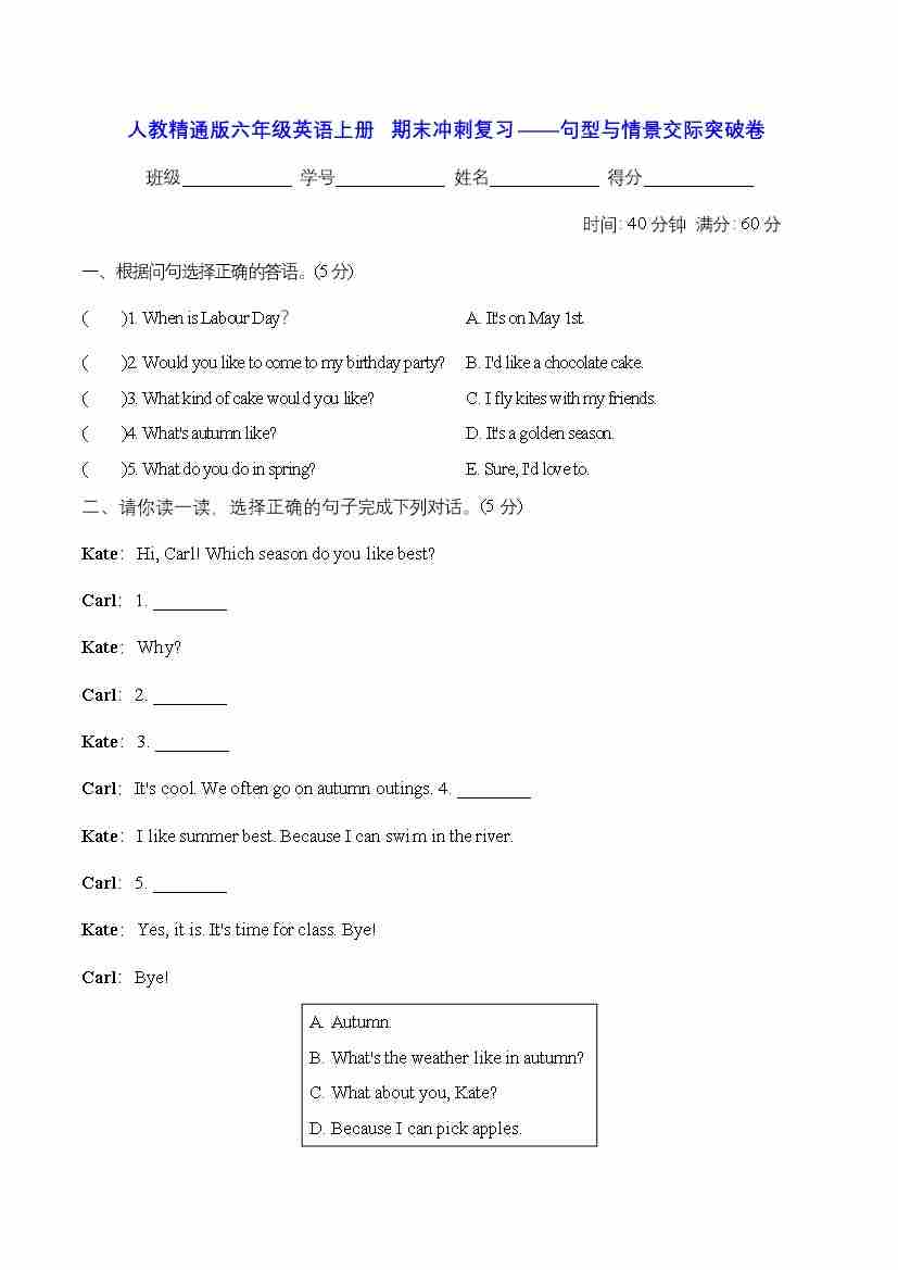 人教精通版六年级英语上册 期末冲刺复习——句型与情景交际突破卷【含答案】