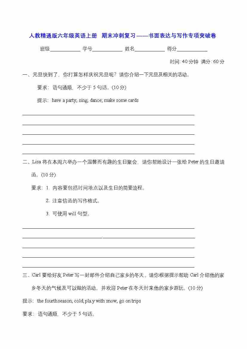 首页 > 全部 > 期末专项 > 人教精通版六年级英语上册 期末冲刺复习——书面表达与写作专项突破卷【含答案】