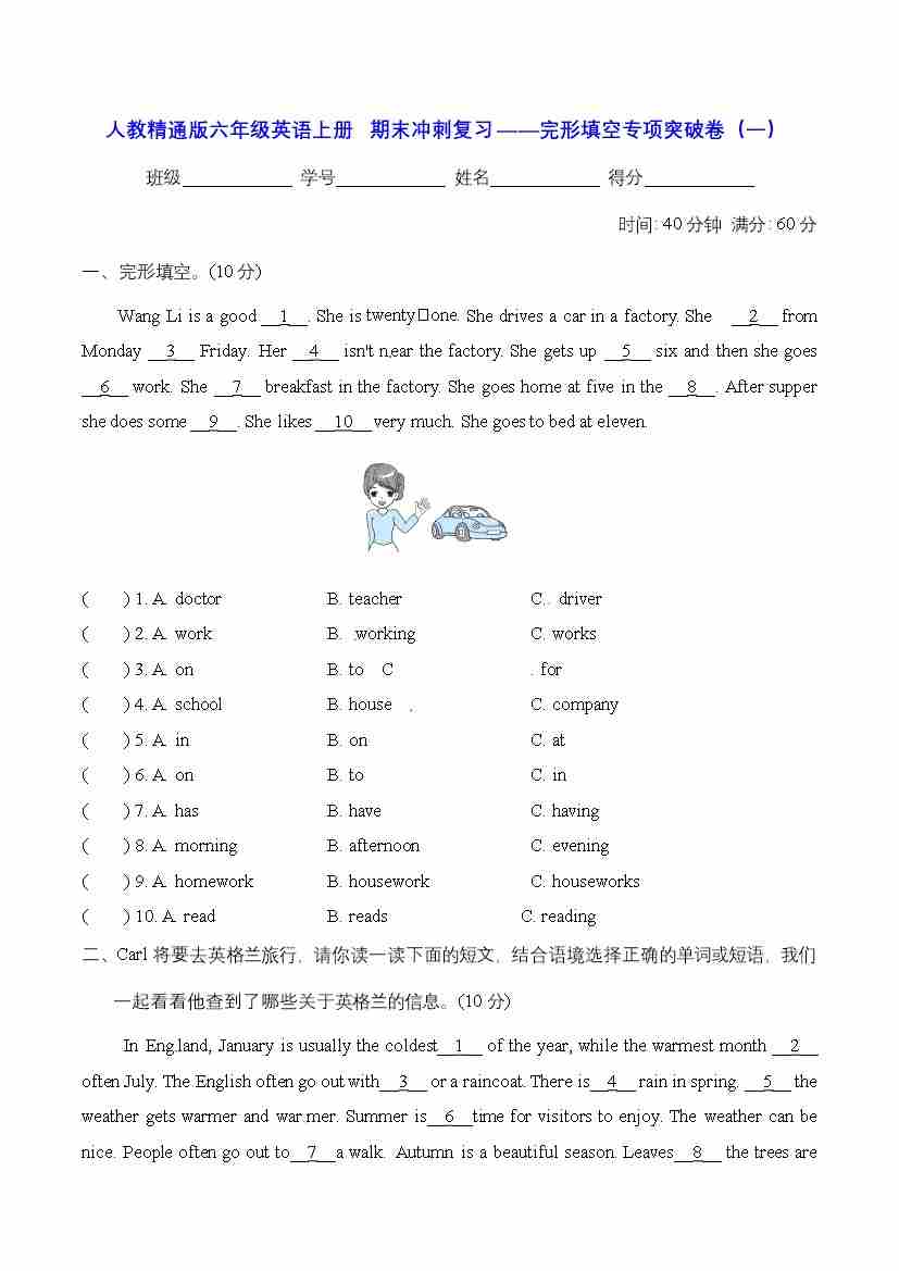 首页 > 全部 > 期末专项 > 人教精通版六年级英语上册 期末冲刺复习——完形填空专项突破卷(一)【含答案】
