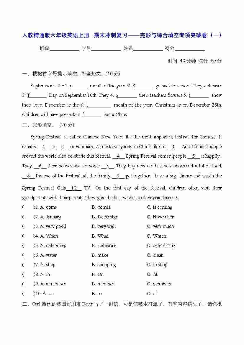 人教精通版六年级英语上册 期末冲刺复习——完形与综合填空专项突破卷(一)【含答案】