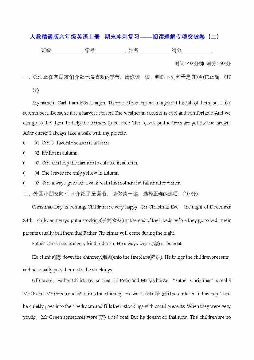 人教精通版六年级英语上册 期末冲刺复习——阅读理解专项突破卷(二)【含答案】