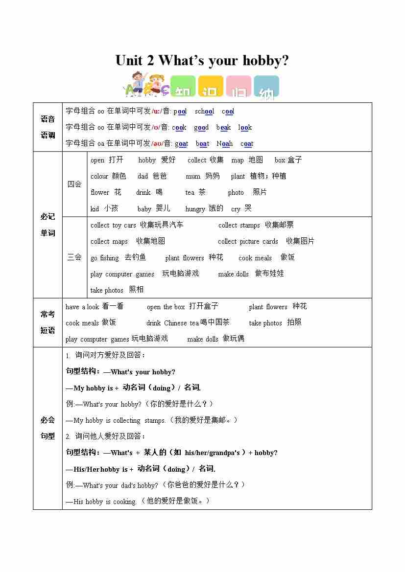 首页 > 全部 > 知识点结 > Unit 2 What's your hobby(知识清单)英语人教精通版六年级上册